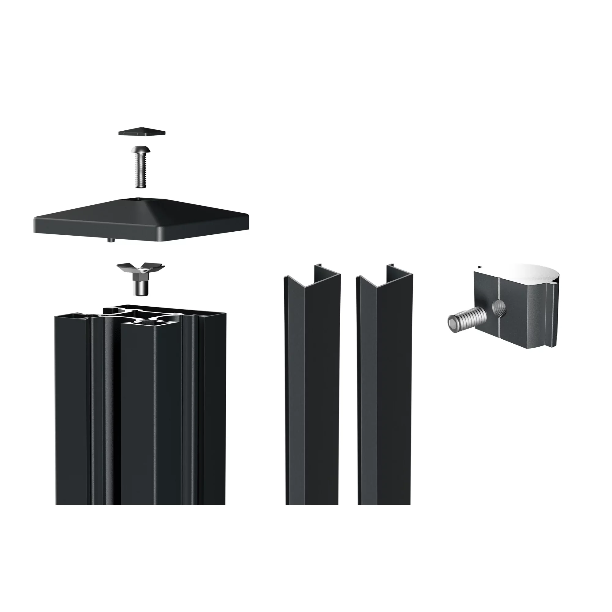 Der Lieferumfang umfasst den Pfosten sowie Abdeckkappen, End-Nutensteine und Abdeckleisten.
