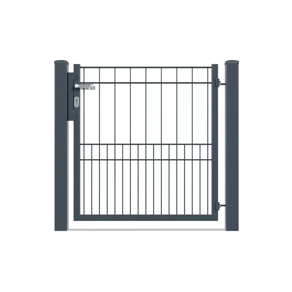 Du erhältst das Gartentor VARIO MILO mit sämtlichem Anschlagzubehör, einem Aluminiumtürgriff und einem Profilzylinder.