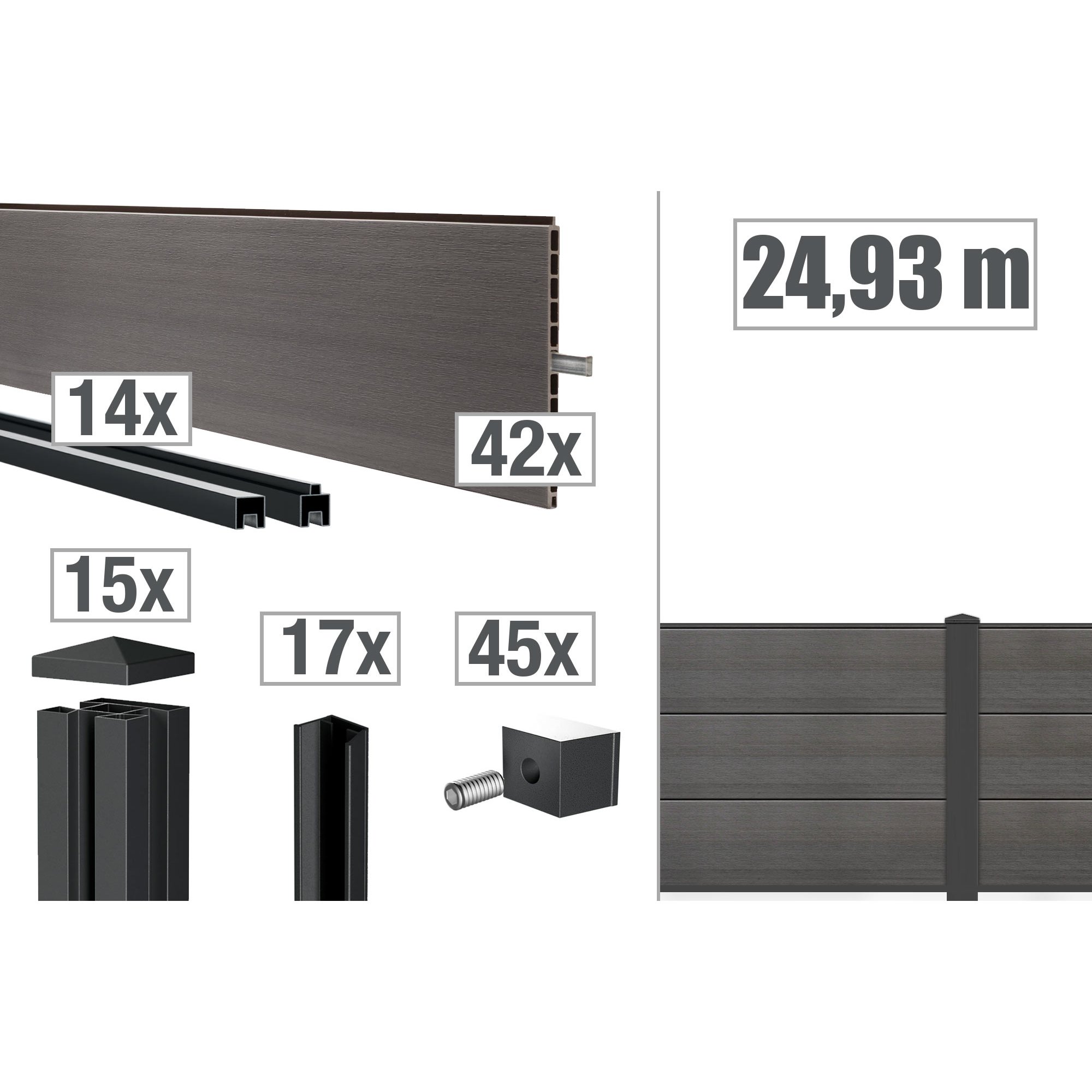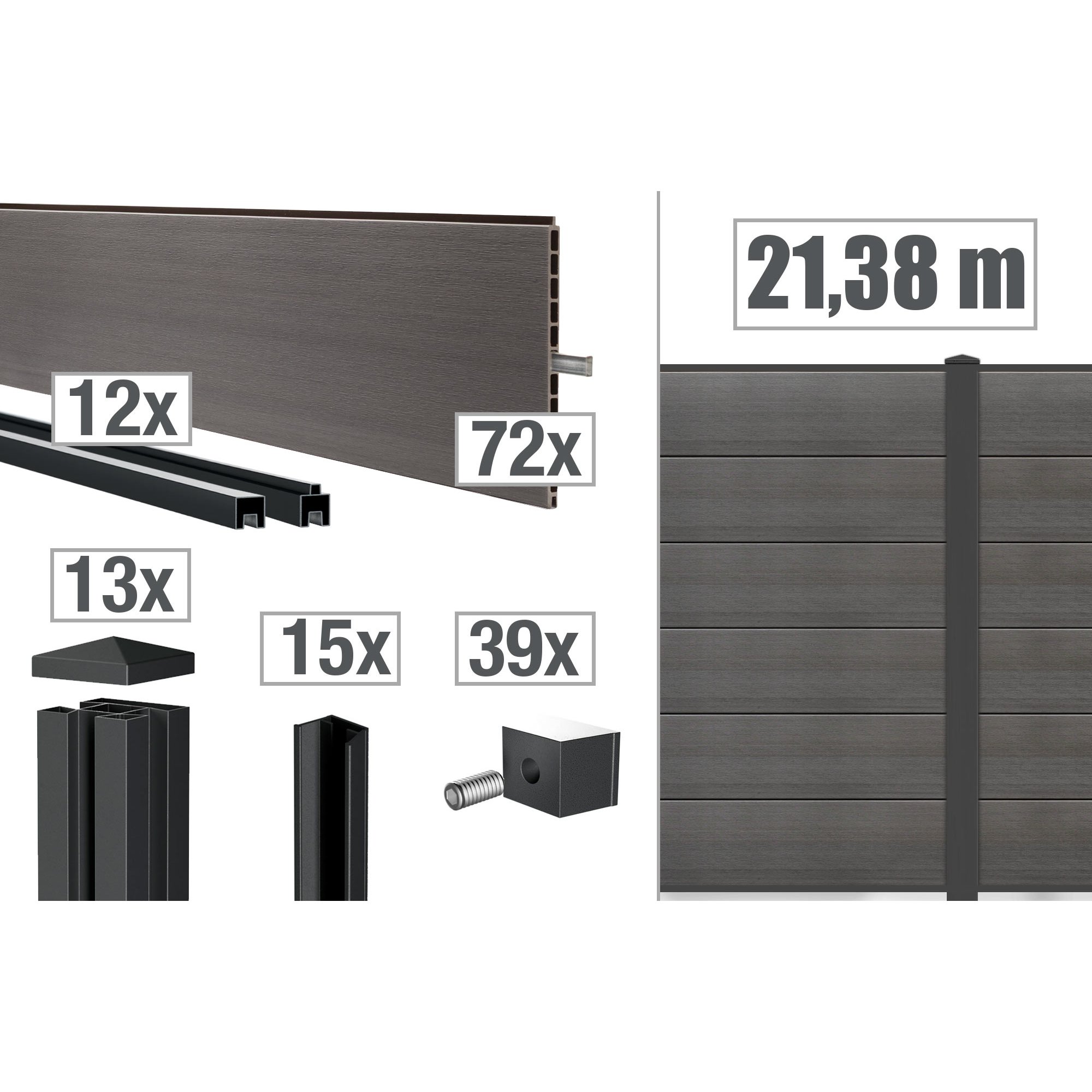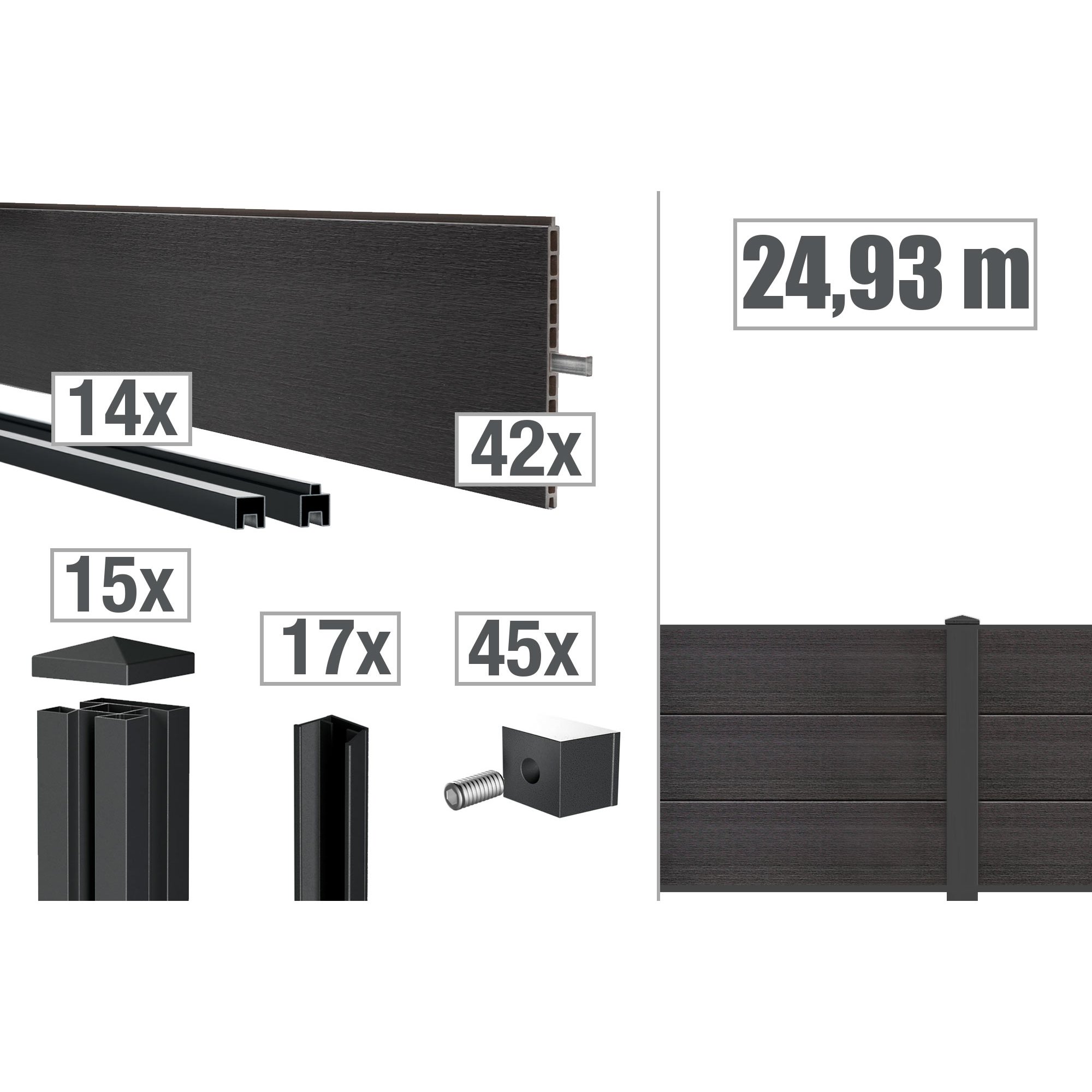 Im Lieferumfang sind die Zaunpaneele, Abschlussleisten, Profiladapter und Zaunpfosten enthalten, sodass Du alles hast, um mit Deiner Montage zu starten.
