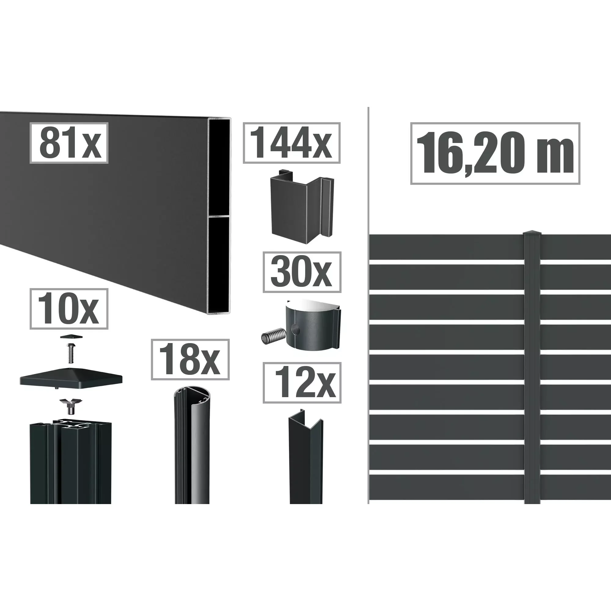 Im Lieferumfang sind die Zaunelemente, Pfosten, Fußplatten und der Innensechskantschlüssel enthalten.
